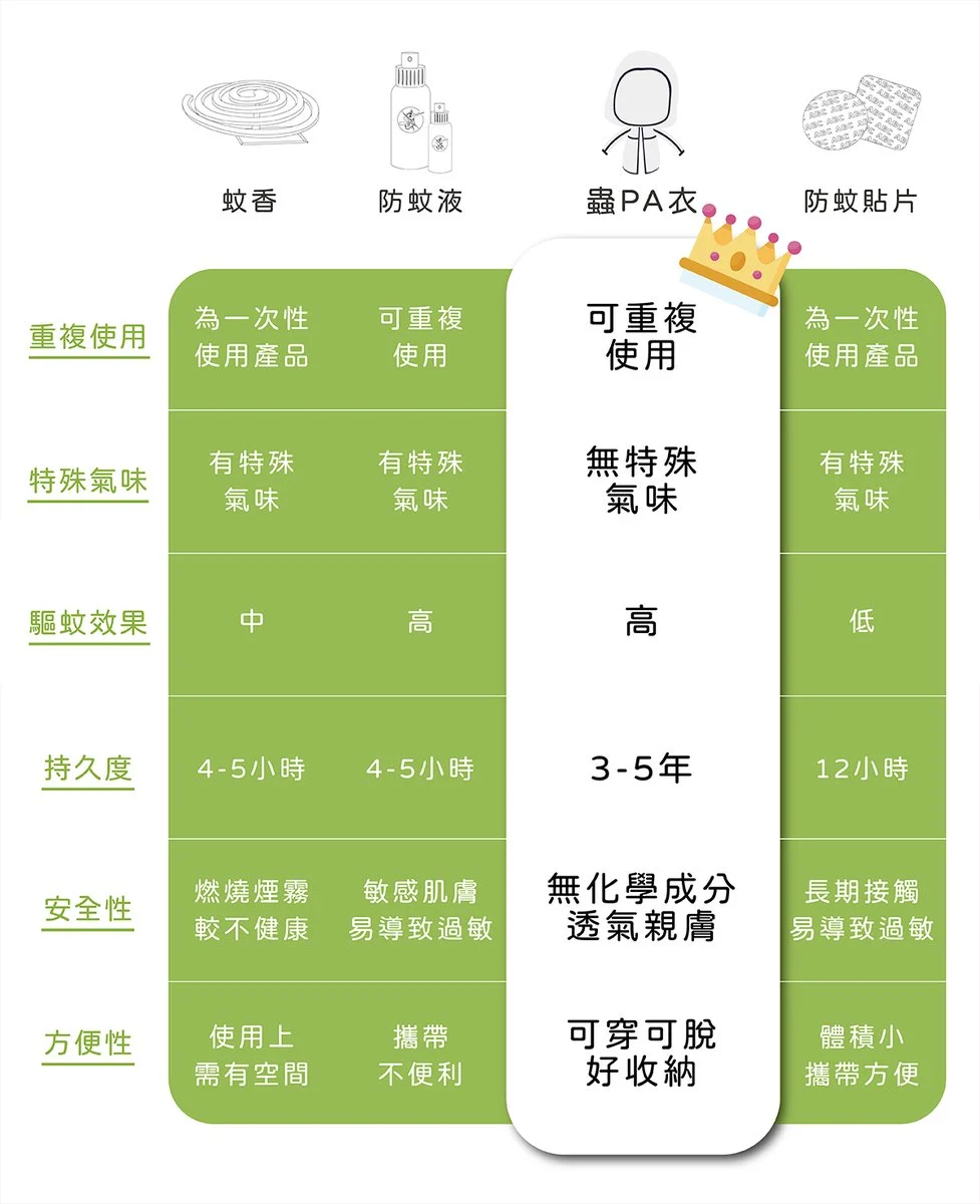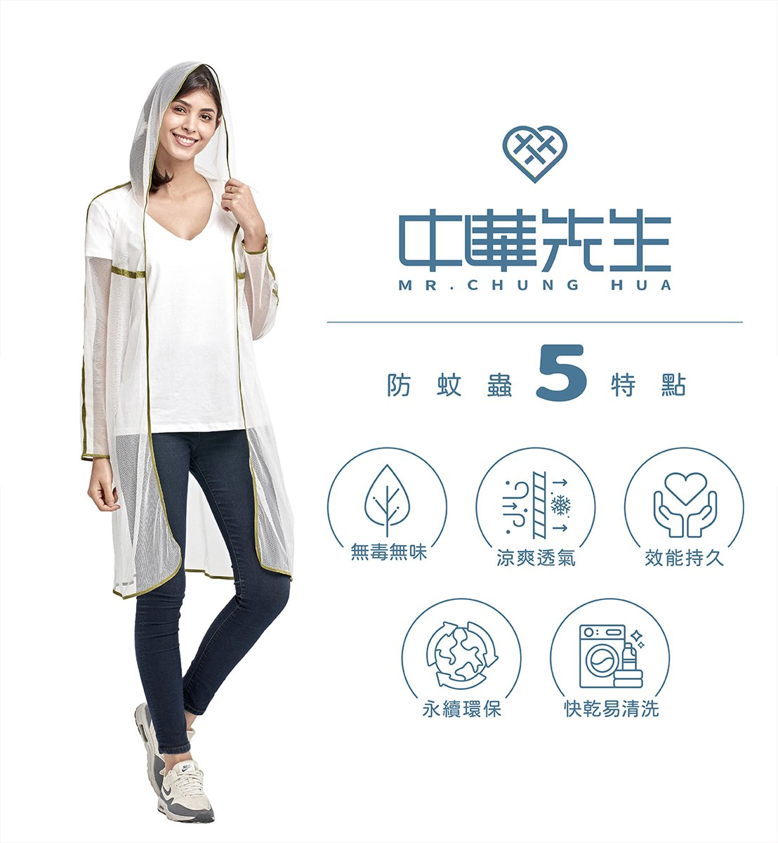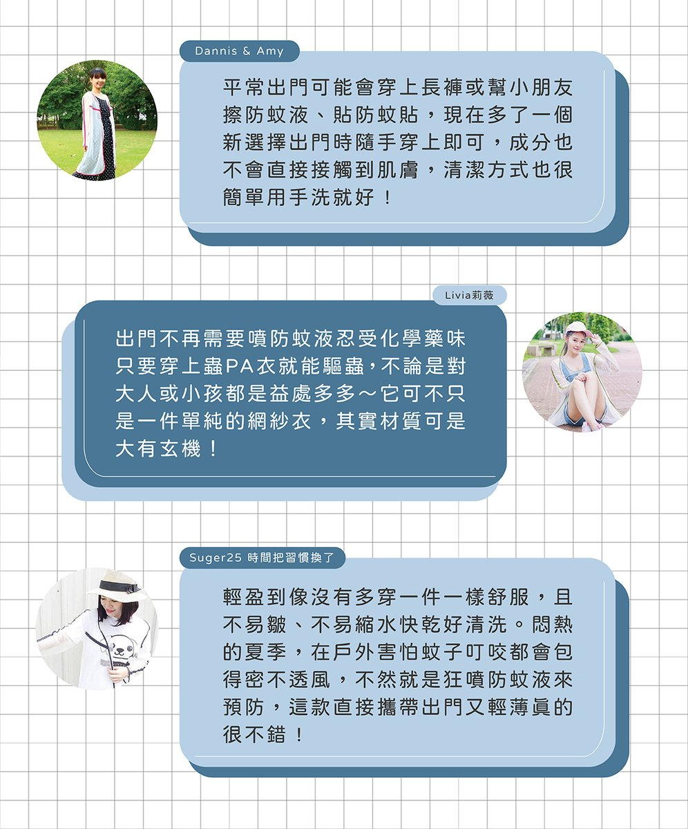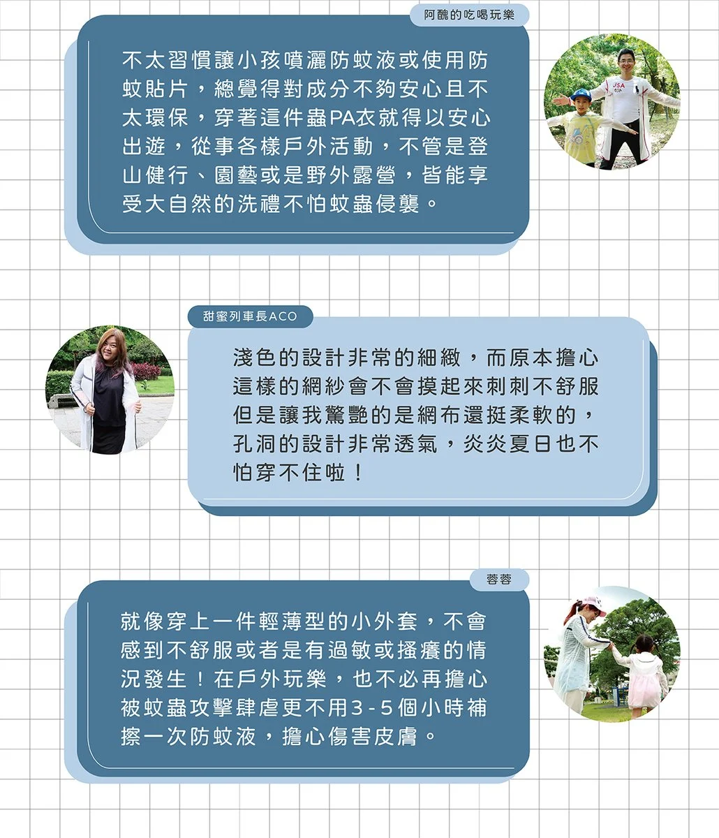 - 有效防蟲成分專利技術加入母粒製成,抽絲製造,效果加倍持久